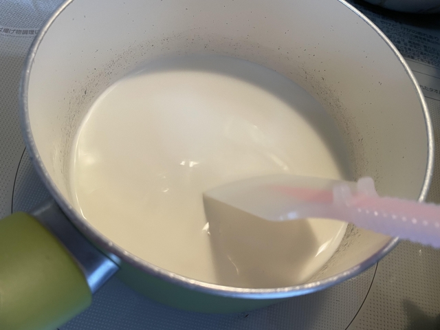 寒天が溶けたら火を止め、すぐに牛乳を入れるのではなく、少しだけ時間を置いて温度を落ち着かせます。